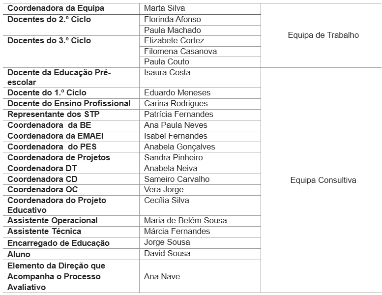 Este trabalho de autoavaliação é supervisionado pela Equipa de Autoavaliação da Escola (EAAEAMC), de caráter multidisciplinar. Esta equipa integra docentes dos diferentes níveis de ensino, elementos do pessoal não docente (assistentes operacionais e administrativos), bem como as coordenadoras dos Diretores de Turma (DT), da Biblioteca Escolar (BE), de Projetos, do Projeto Educativo, de Cidadania e Desenvolvimento (CD), de Oferta Complementar (OC), do PES e da EMAEI. Inclui ainda representantes dos pais e encarregados de educação, dos alunos e dos Serviços Técnico-Pedagógicos (STP).