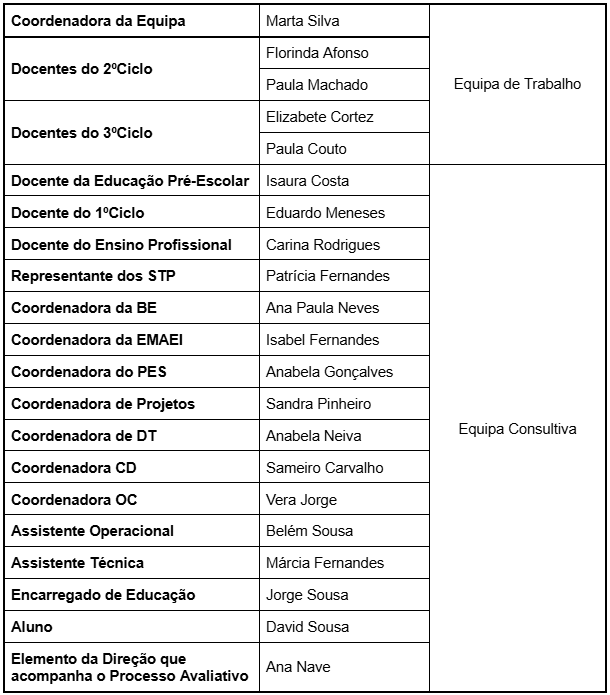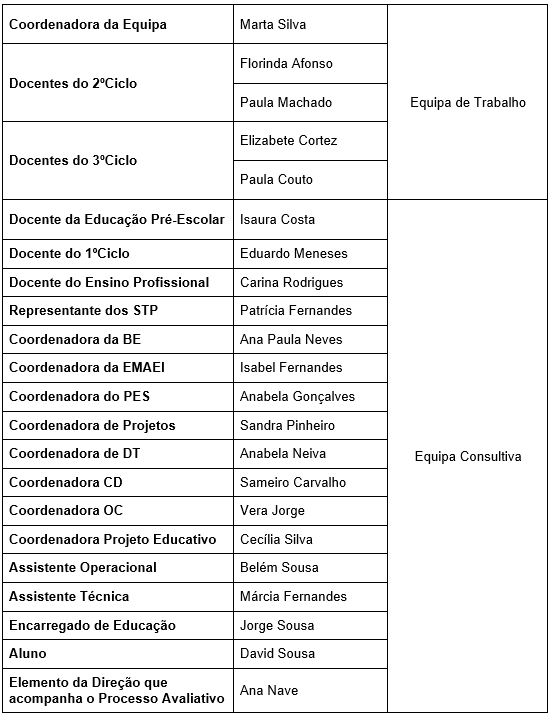 Este trabalho de autoavaliação é supervisionado pela Equipa de Autoavaliação da Escola (EAAEAMC), de caráter multidisciplinar. Esta equipa integra docentes dos diferentes níveis de ensino, elementos do pessoal não docente (assistentes operacionais e administrativos), bem como as coordenadoras dos Diretores de Turma (DT), da Biblioteca Escolar (BE), de Projetos, do Projeto Educativo, de Cidadania e Desenvolvimento (CD), de Oferta Complementar (OC), do PES e da EMAEI. Inclui ainda representantes dos pais e encarregados de educação, dos alunos e dos Serviços Técnico-Pedagógicos (STP).