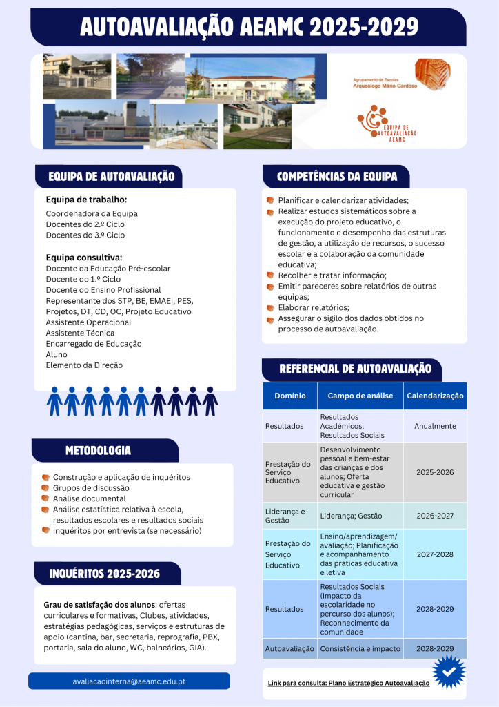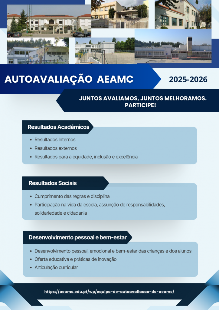 O processo de autoavaliação do AEAMC conta com o apoio e supervisão de um grupo de trabalho do Projeto “Observatório de Autoavaliação de Escolas”, do Centro de Investigação em Educação da Universidade do Minho.